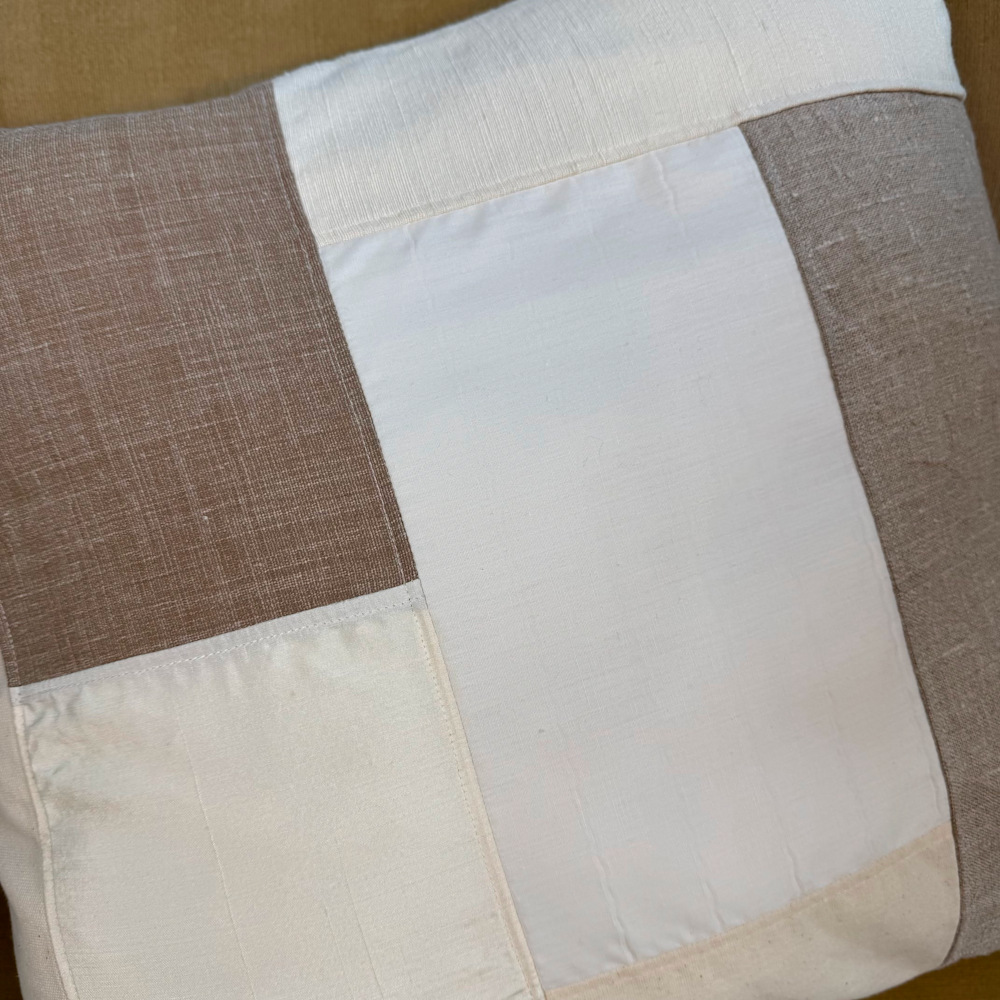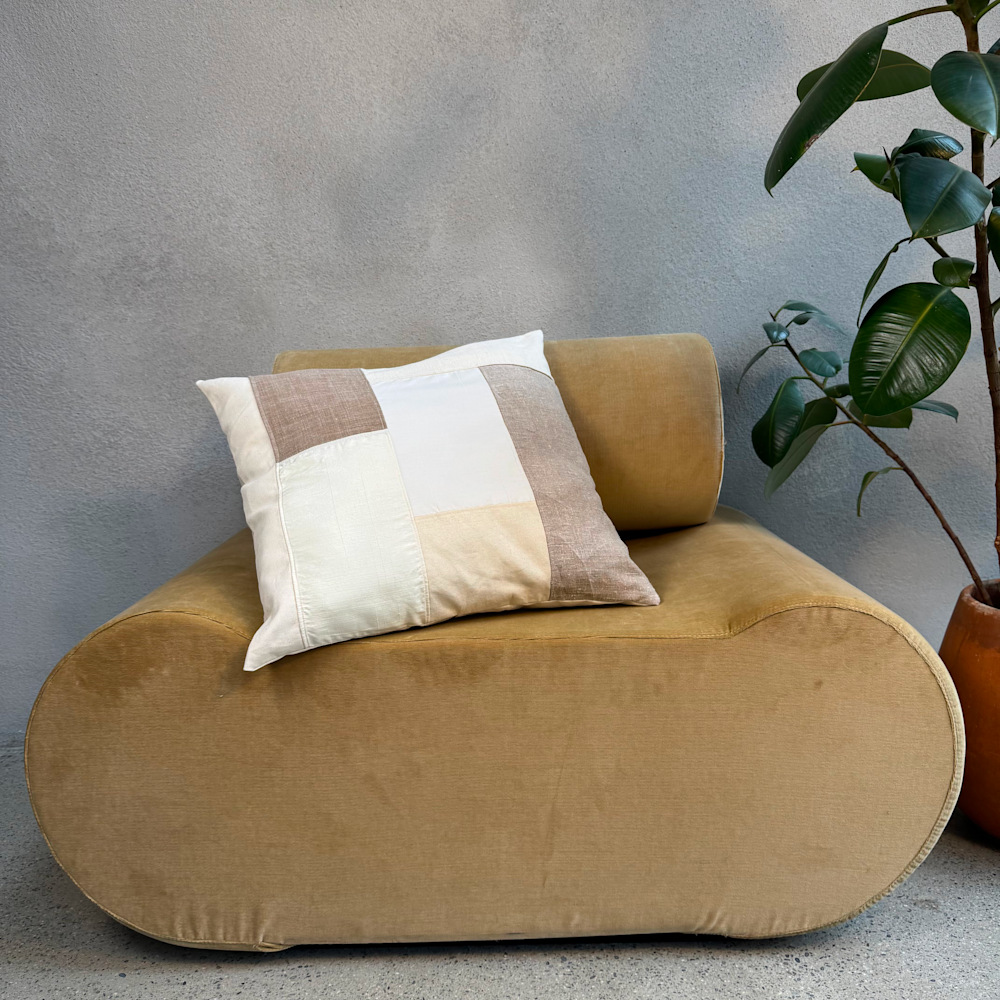 Découvrez la housse de coussin décoratif Pilö, pensée comme une véritable pièce textile d’exception. Entièrement réalisée à la main, elle assemble avec soin des tissus anciens soigneusement chinés et upcyclés, en coton, polyester ou lin et est ici accentuée par une touche de soie sauvage beige rosée, pour donner naissance à une création authentique et chargée d’histoire.