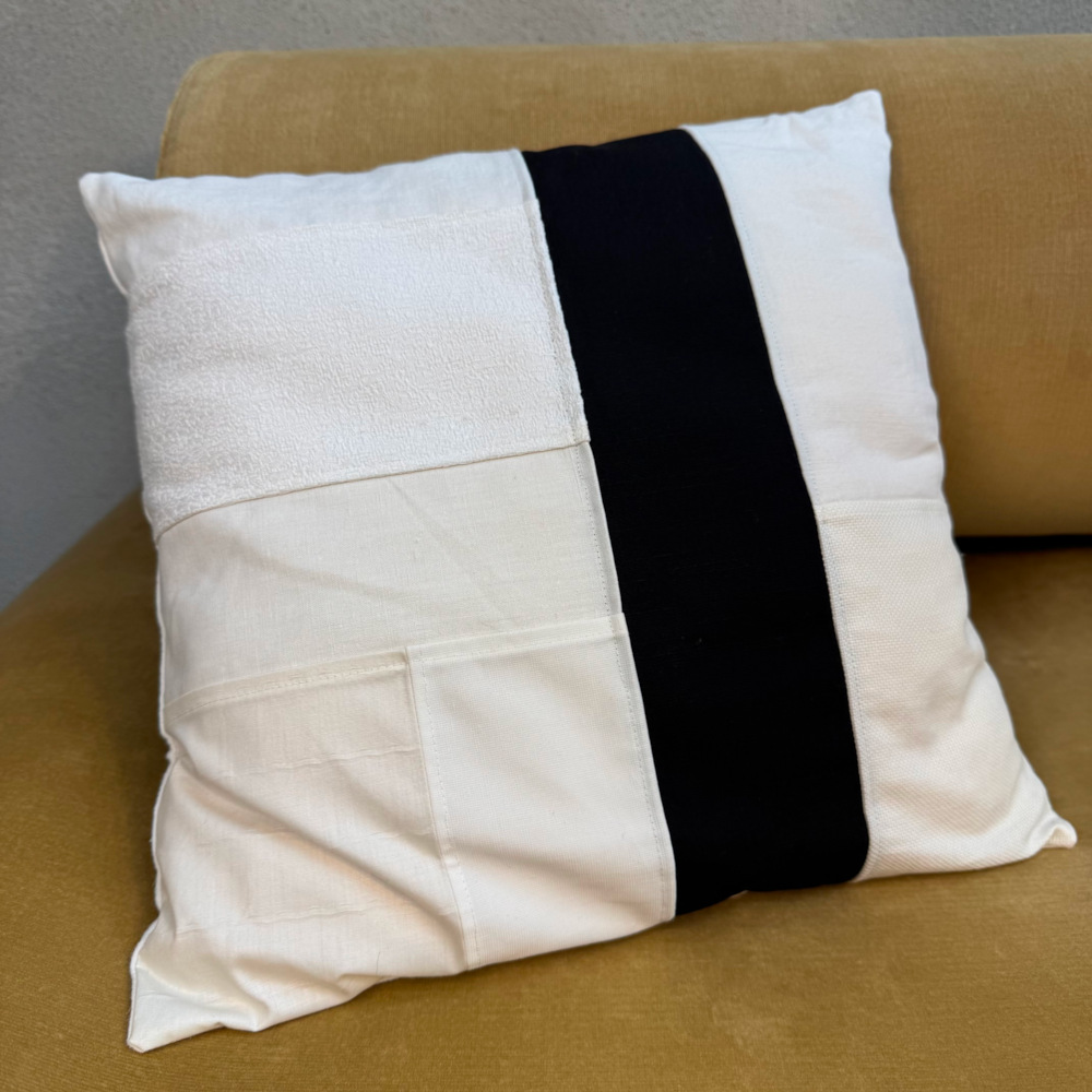 Découvrez la housse de coussin décoratif Pilö, pensée comme une véritable pièce textile d’exception. Entièrement réalisée à la main, elle assemble avec soin des tissus anciens soigneusement chinés et upcyclés, en coton ou lin, naturel ou blanchi et ici accentuée par une bande de lin noir, pour donner naissance à une création authentique et chargée d’histoire.