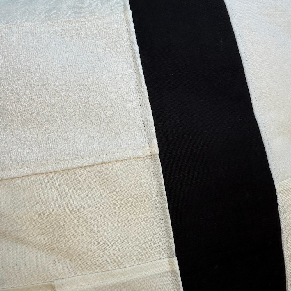 Son assemblage s’inspire du patchwork coréen, avec un travail attentif sur les lignes et les équilibres. Les matières se répondent, entre douceur et relief, dans un jeu subtil de contrastes qui donne à chaque pièce une présence singulière.