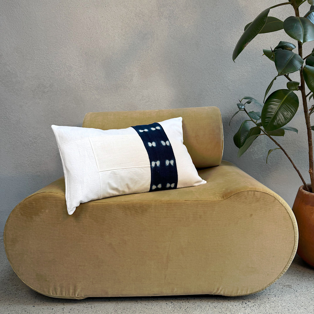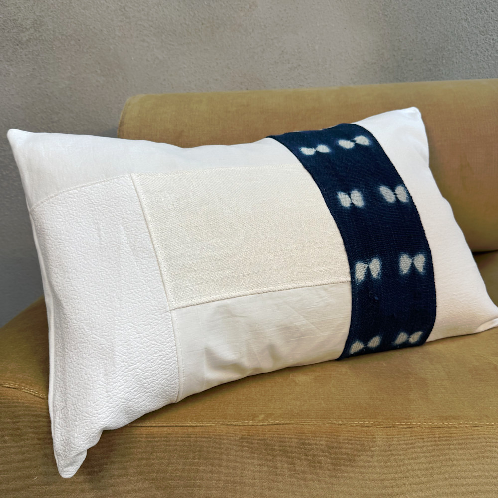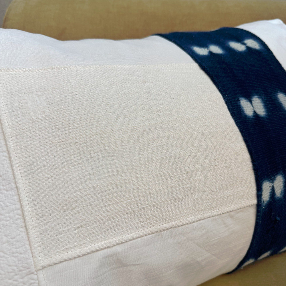 Découvrez la housse de coussin décoratif Pilö, pensée comme une véritable pièce textile d’exception. Entièrement réalisée à la main, elle assemble avec soin des tissus anciens soigneusement chinés et upcyclés, en coton, lin et ici une remarquable pièce de bogolan indigo du Mali, pour donner naissance à une création authentique et chargée d’histoire.